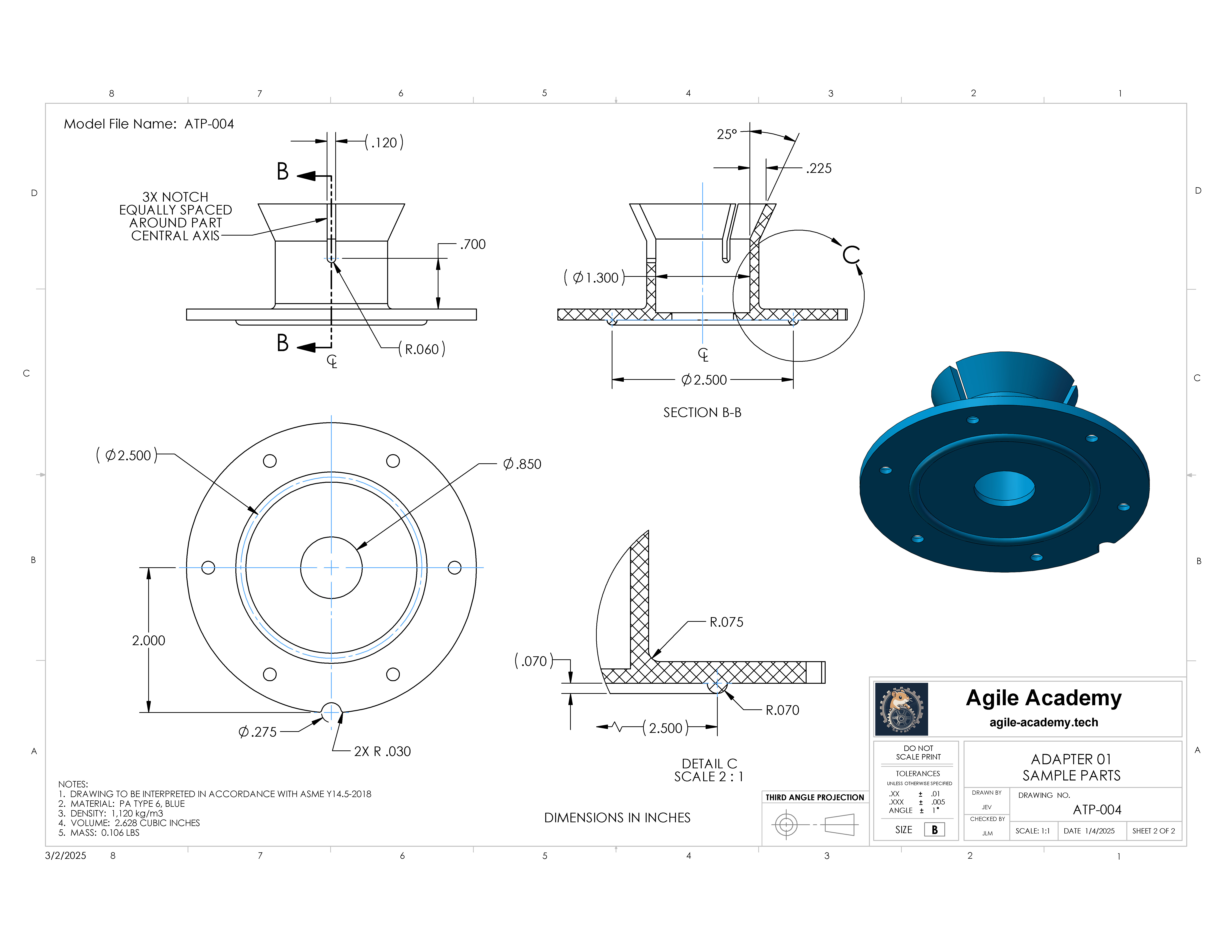 This is a nylon adapter drawn in inches. It is made of PA type 6 (nylon) with a density of 1,120 kg per cubic meter.