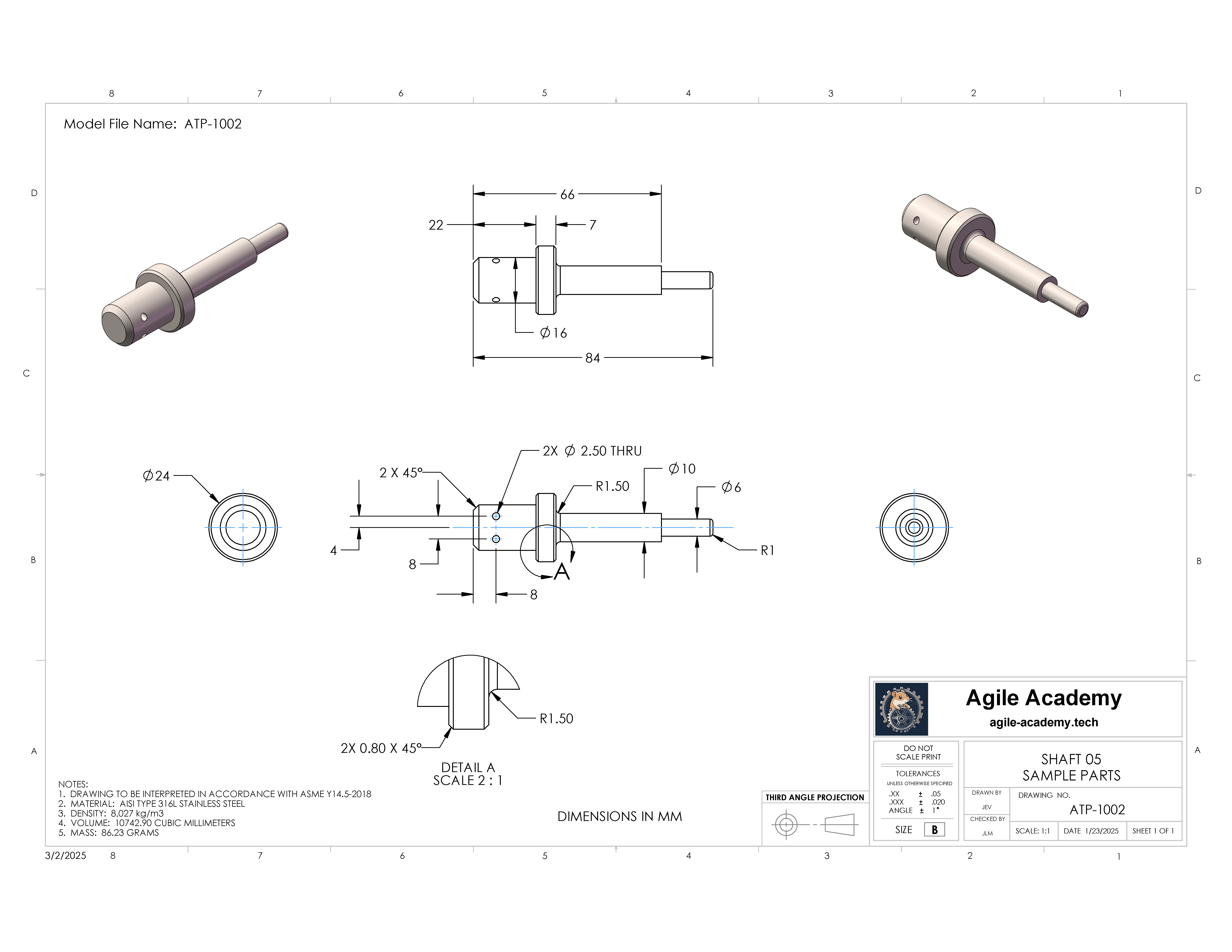This is a stainless steel shaft drawn in millimeters. It is made of AISI Type 316L stainless steel with a density of 8,027 kg per cubic meter.